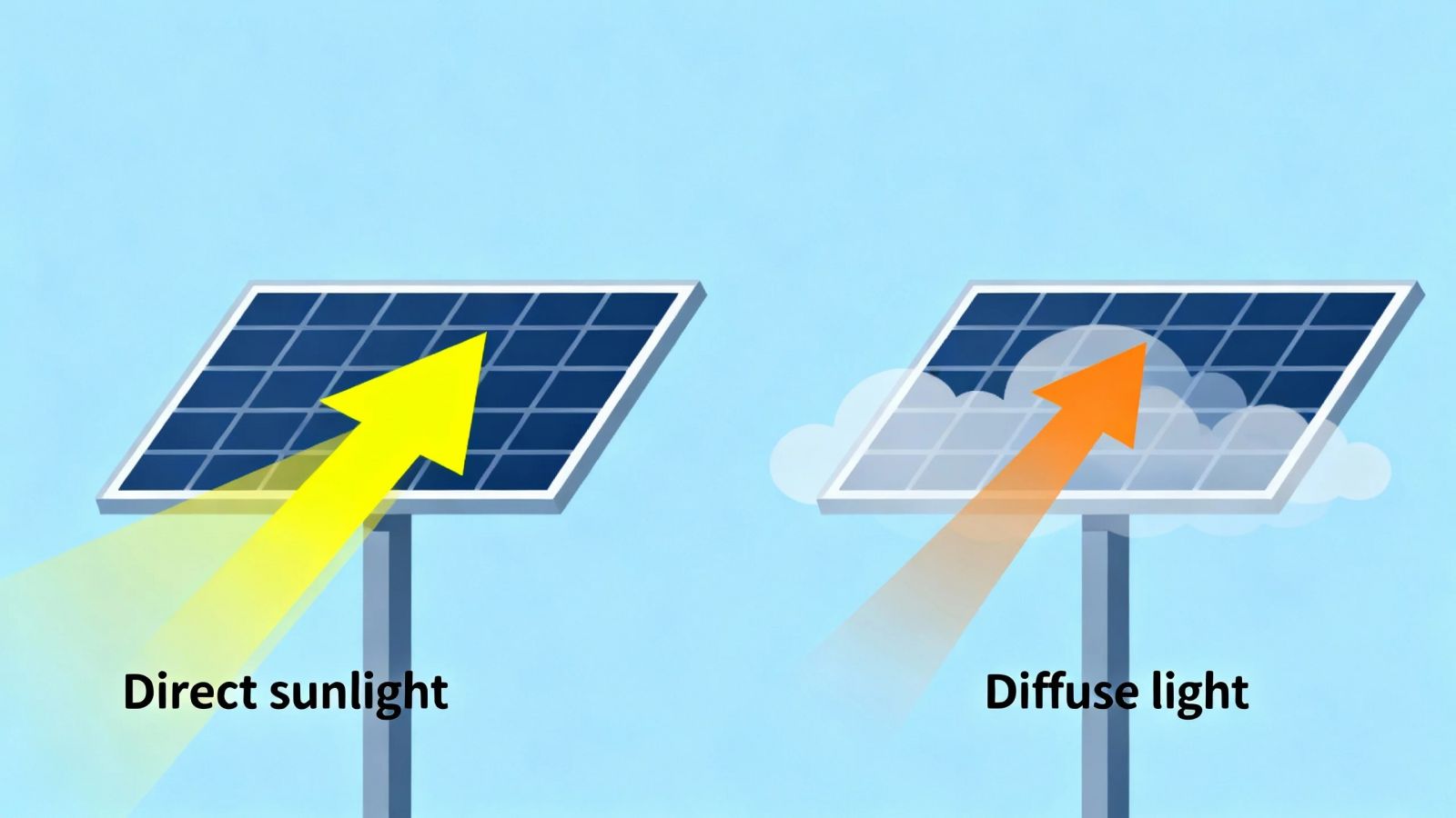 Tấm pin mặt trời không chỉ hấp thụ ánh sáng trực tiếp từ mặt trời mà còn hấp thụ Ánh sáng Khuếch tán (Diffuse Light).